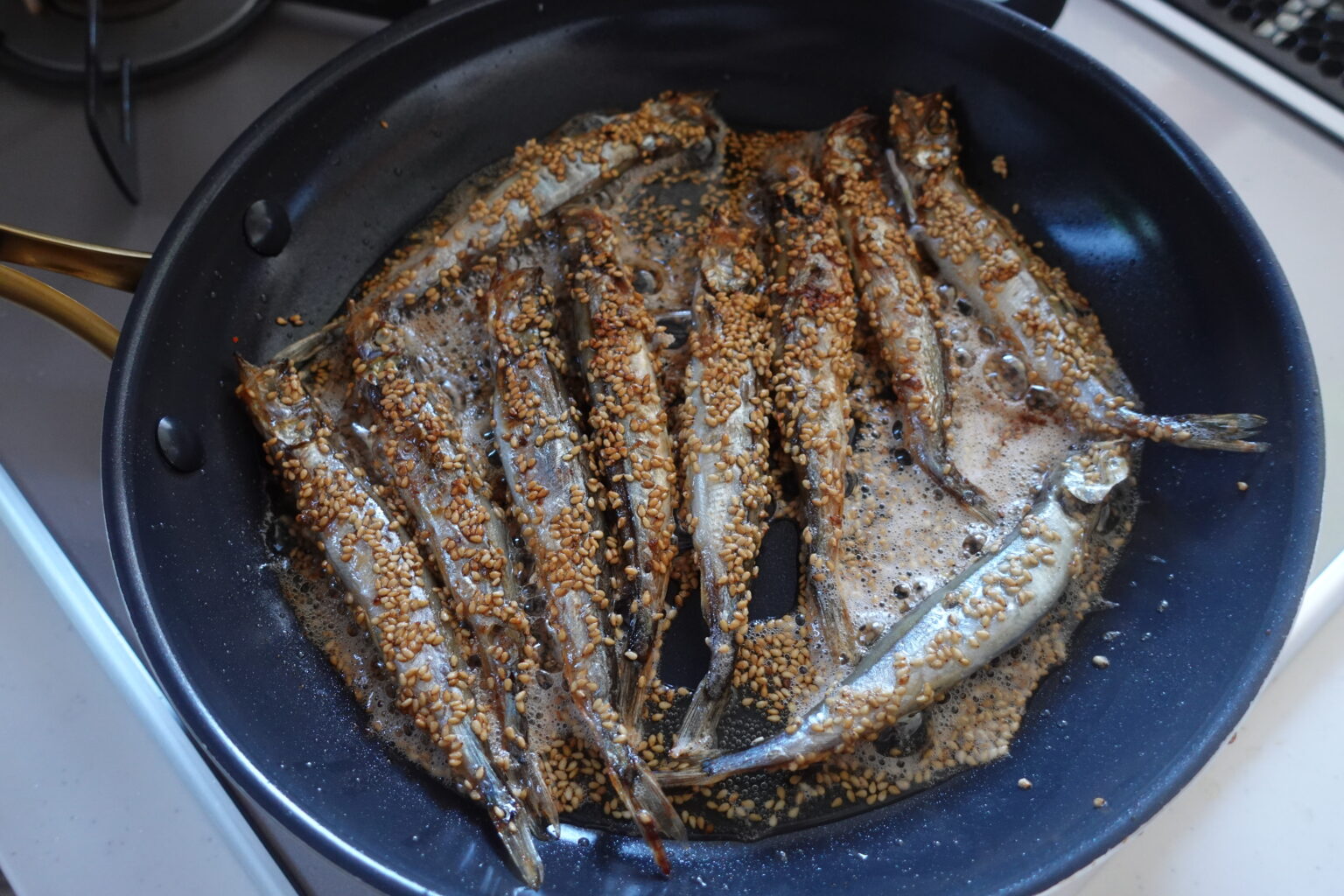 今夜のメインはプチプチ食感おいしい「ししゃものごま焼き」を作りました♪ いつものししゃもにたっぷりの白ごまをまぶしてフライパンで焼くだけ!口に入れた瞬間に広がるごまの香ばしさとししゃもの旨味が相性抜群です◎カルシウムもたっぷりとれて家族みんなが喜ぶ時短おかずです♪