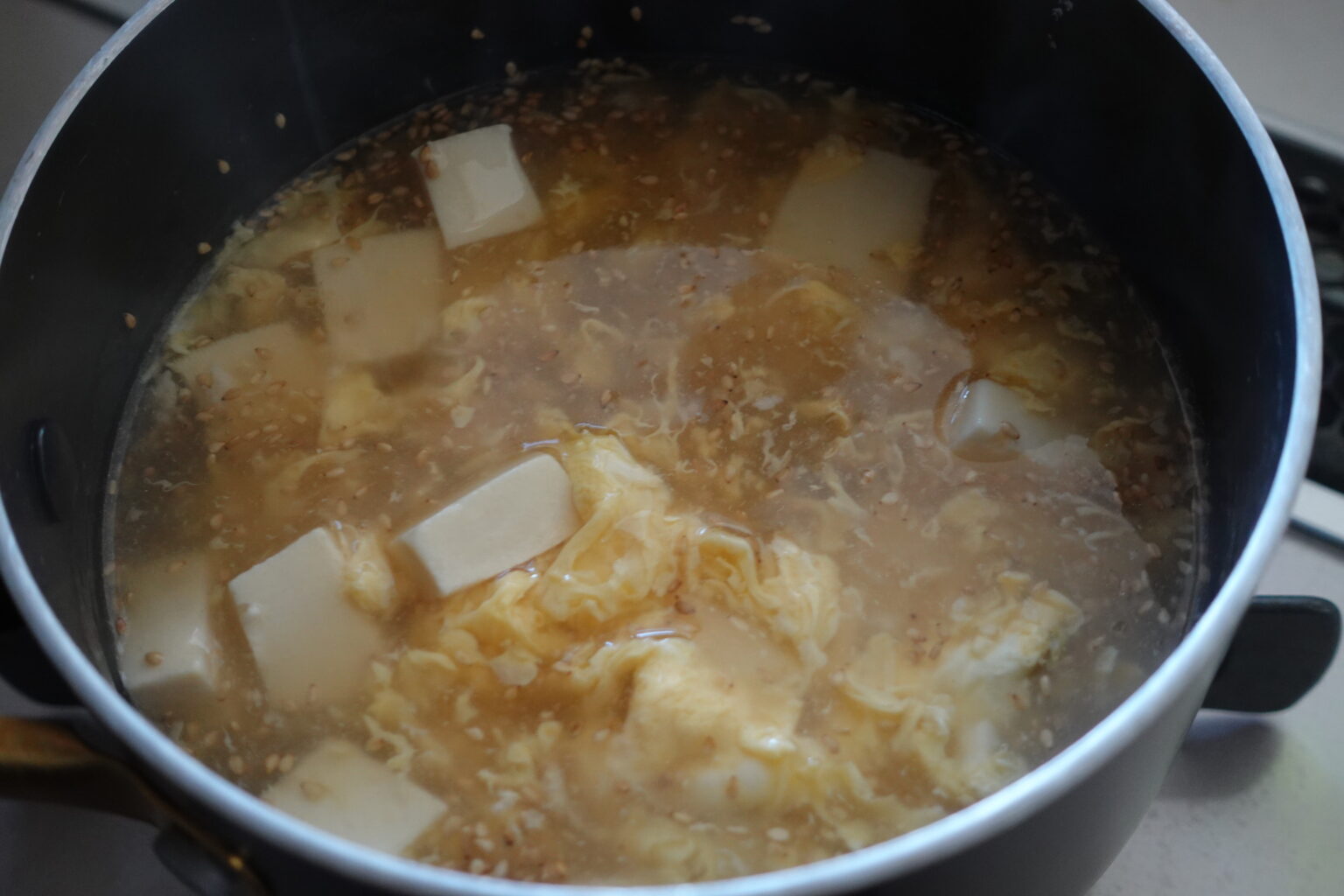 とろみがついたら豆腐を入れて、溶き卵を回し入れる。ごま油をたらし、白いりごまを加えて混ぜる。刻みねぎをふる。