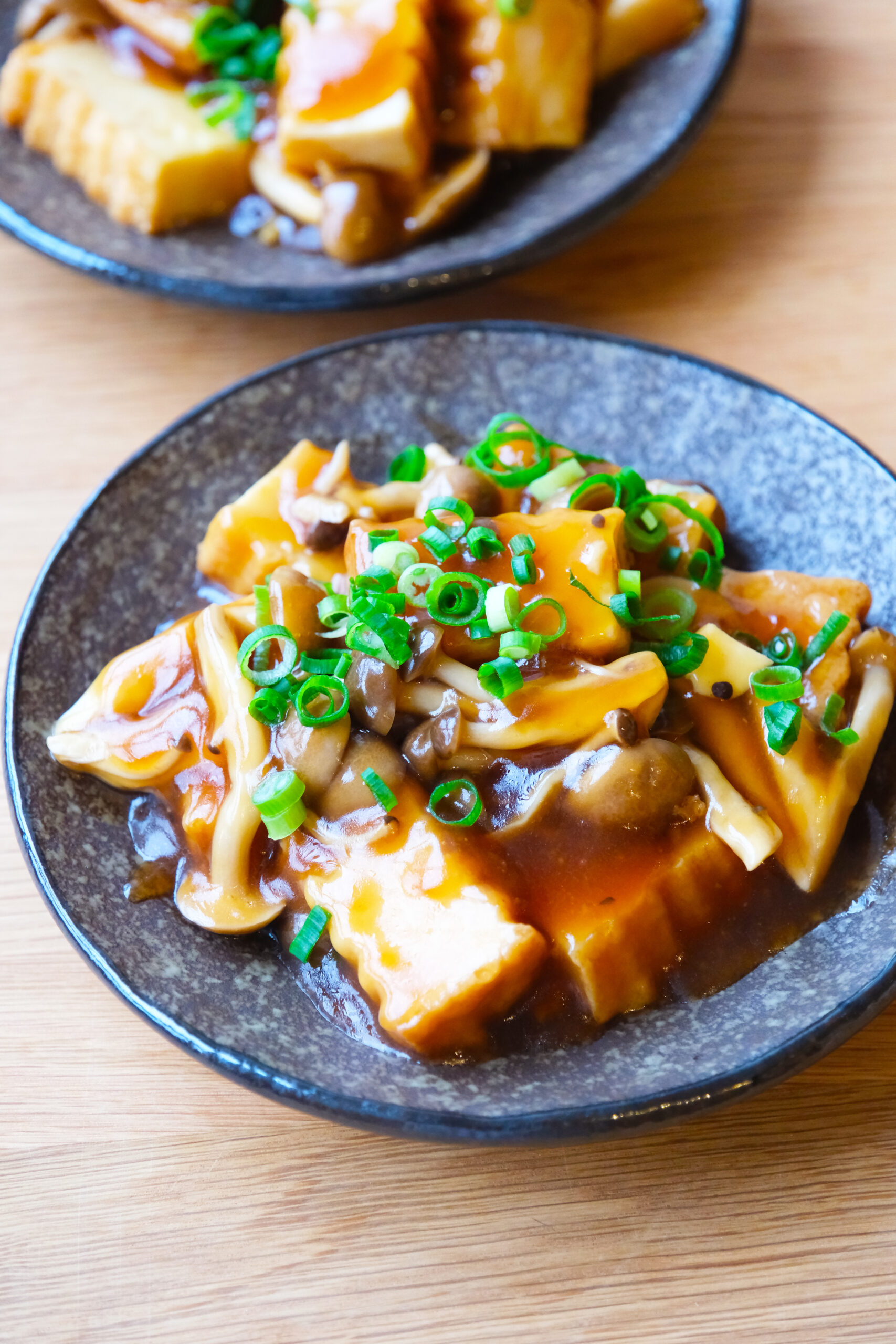 今夜のメインは「厚揚げときのこのオイスターあんかけ」。香ばしく焼いた厚揚げにきのこの旨味たっぷりのオイスターあんがとろ〜り絡みます◎お肉がなくても厚揚げときのこでボリュームも満点♪白いごはんがモリモリすすみます♪
