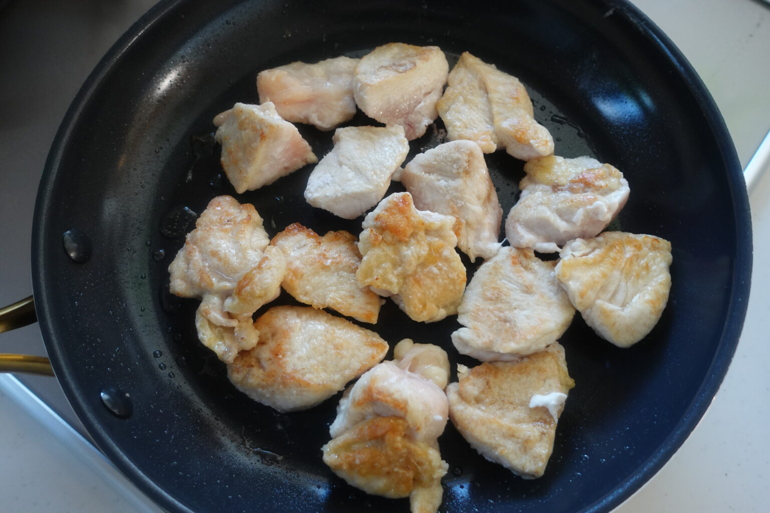 フライパンに油を熱し、鶏むね肉の皮目を下にして中火で焼く。こんがり焼けたら裏返して中まで火が通るまで炒める。