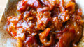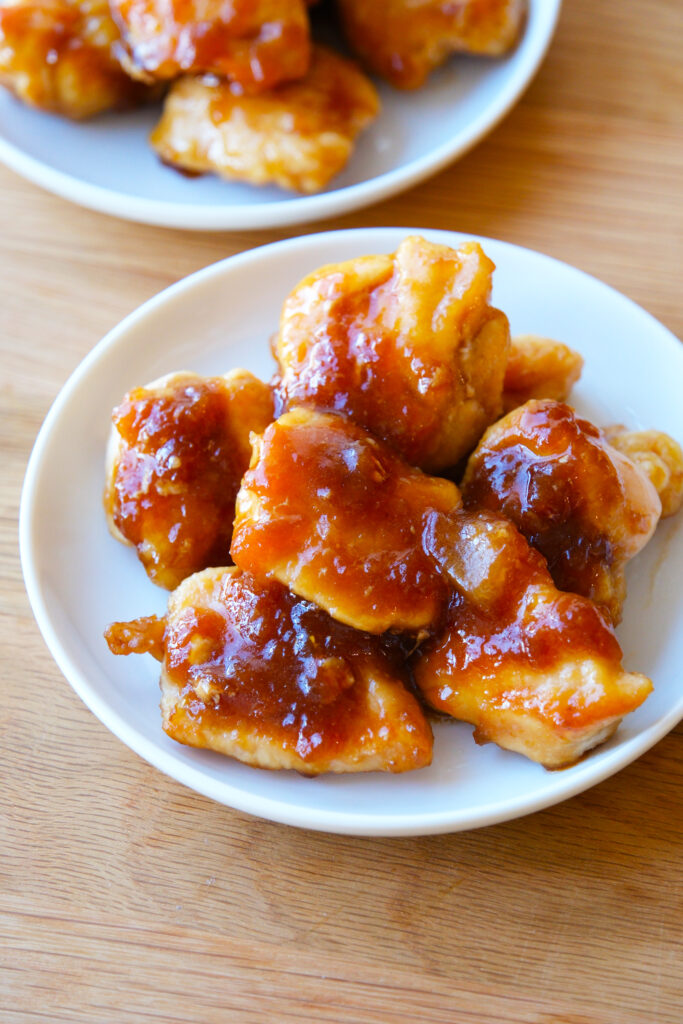 お肉の中まで火が通ったら、余分な油をペーパータオルでふき取り、おろし玉ねぎソースを加えてとろりとするまで煮絡める。