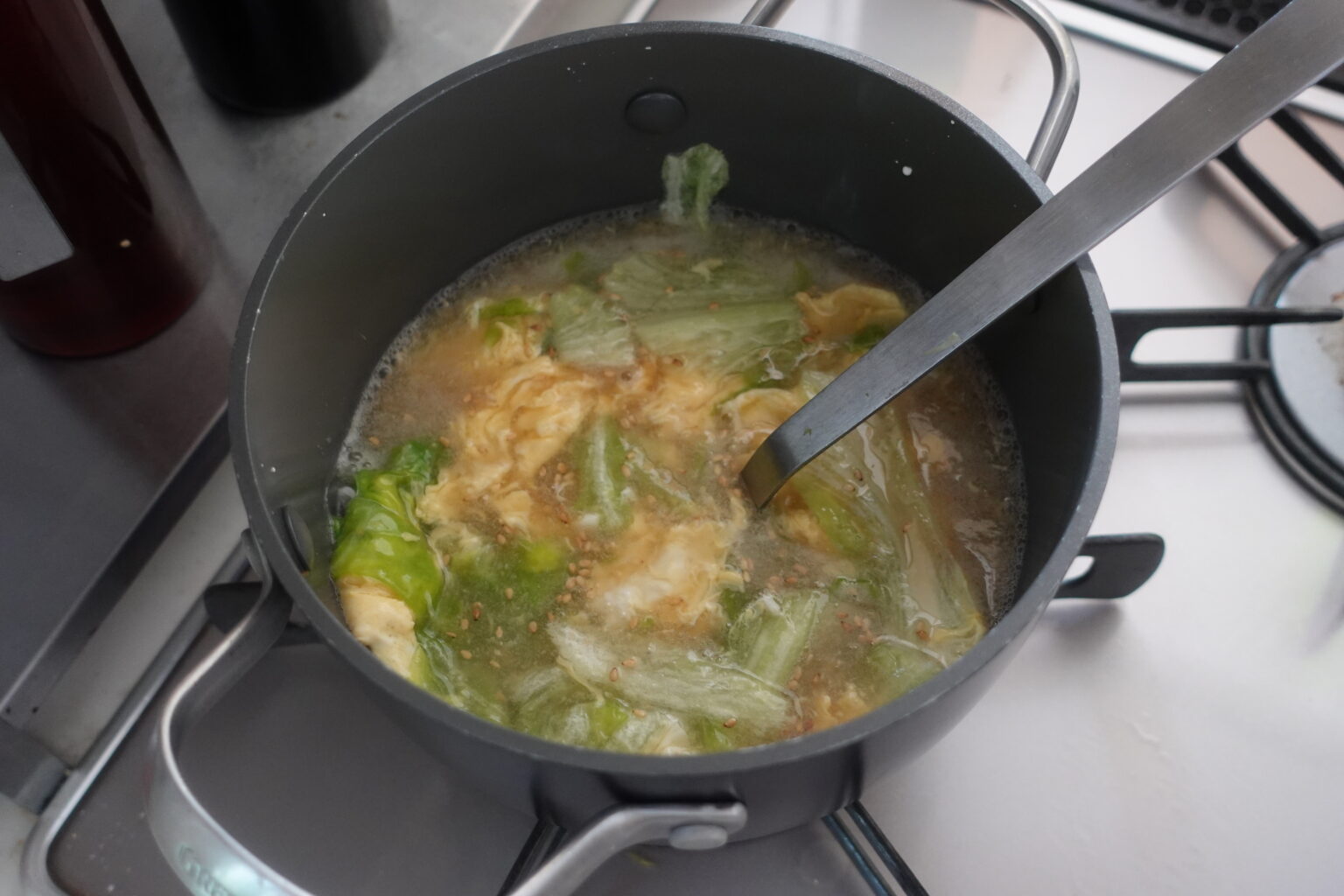とろみがついたらレタスを加え、溶き卵を回し入れる。ごま油をたらし、白いりごまを加えて混ぜる。