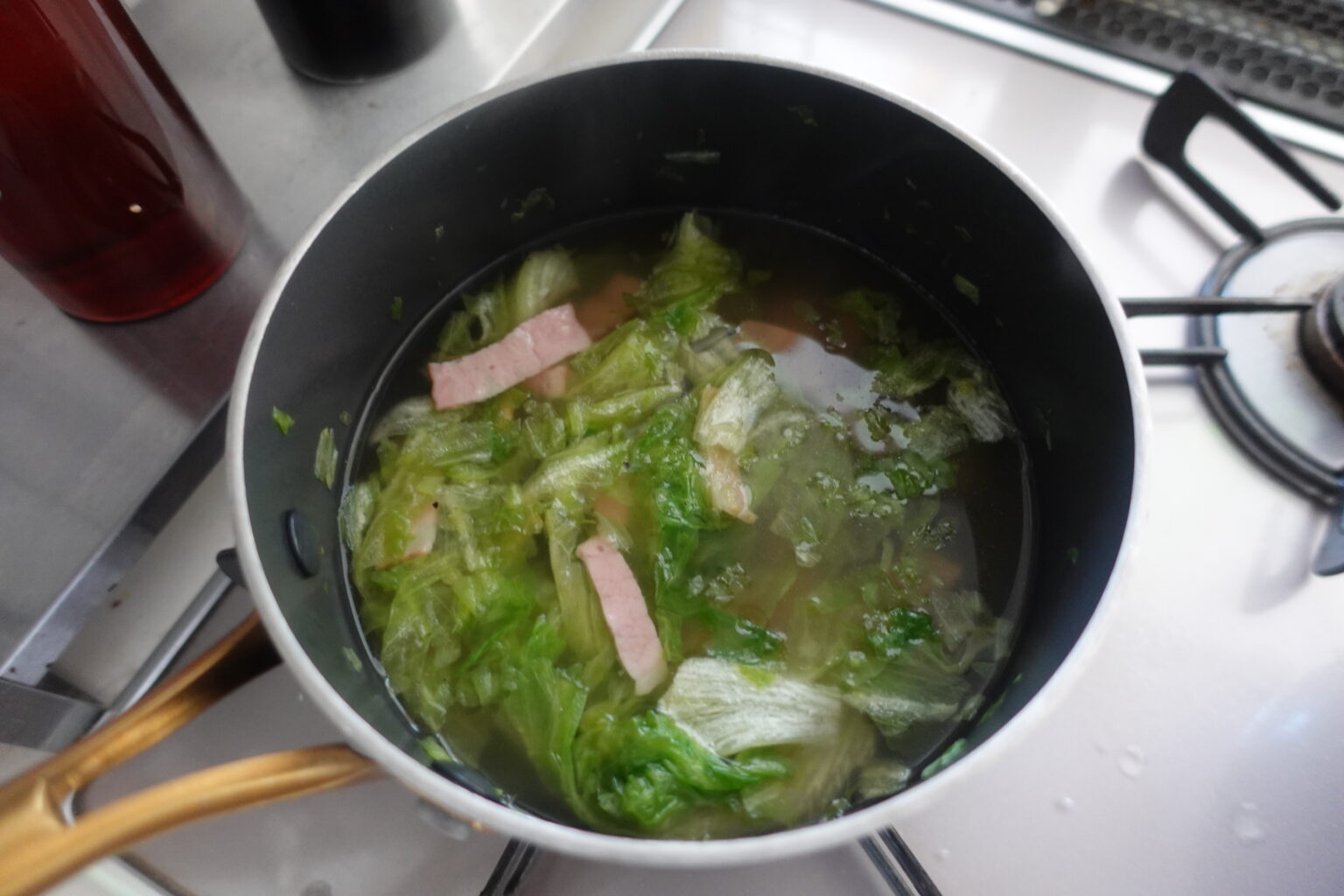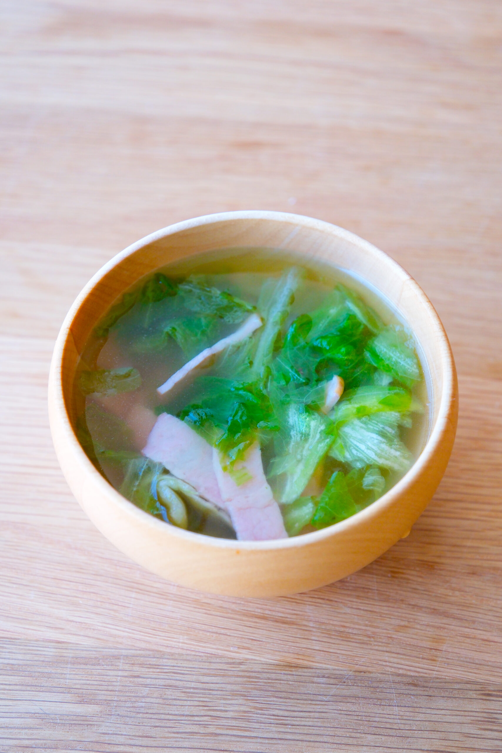 鍋に水を入れて火にかける。沸騰したら顆粒コンソメとベーコンを入れて蓋をしてさっと煮る。レタスを加えてさっと煮て、粗びき黒こしょうをふり味をととのえる。
