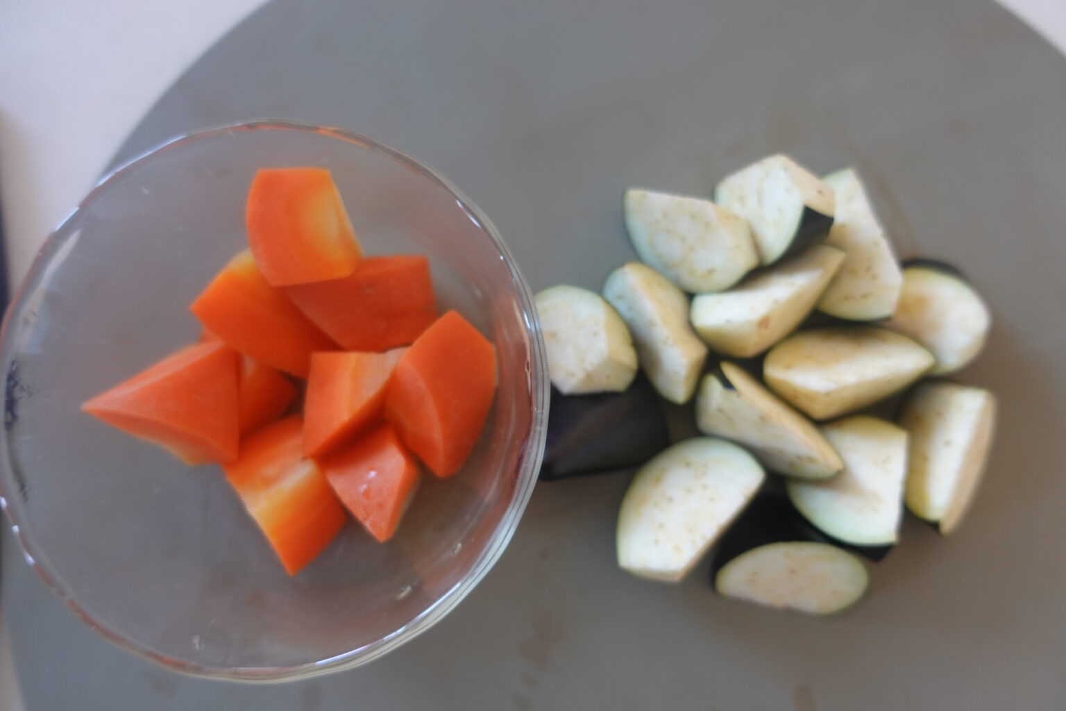 人参はひと口大の乱切りにする。耐熱容器に入れてふんわりとラップをし600W約2分加熱する。なすはヘタを切り落とし、ひと口大の乱切りにする。