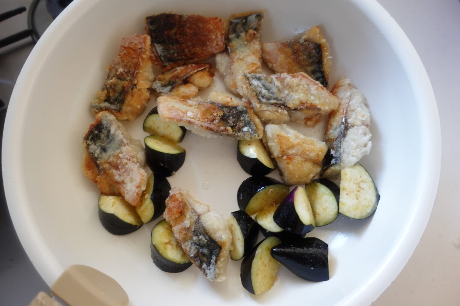 フライパンに油を熱し、塩サバとなすを並べて中火で揚げ焼きにする。
