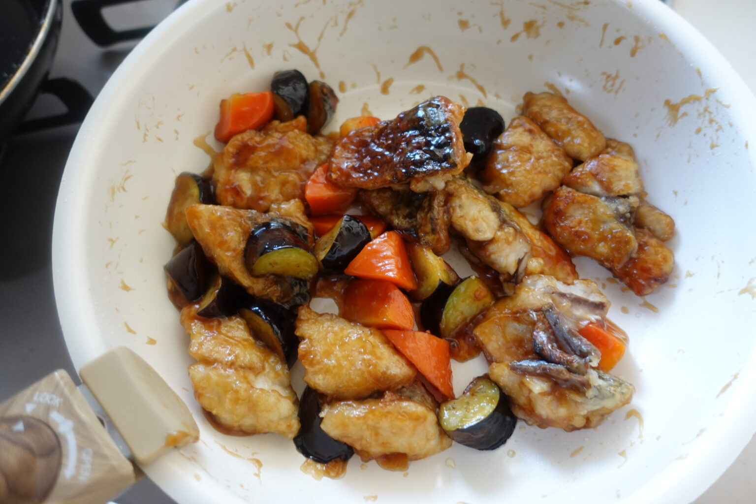 火が通ったら人参を加えてさっと炒める。余分な油をペーパータオルで拭きとり、弱火にしてからよく混ぜ合わせたBを回し入れる。全体にたれがからむように、とろみがつくまで炒める。