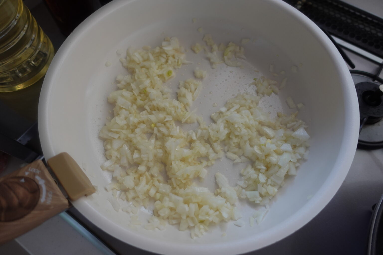 玉ねぎとにんにくはみじん切りにする。フライパンにオリーブオイルを熱し、玉ねぎとにんにくを入れてしんなりするまで中火で炒める。