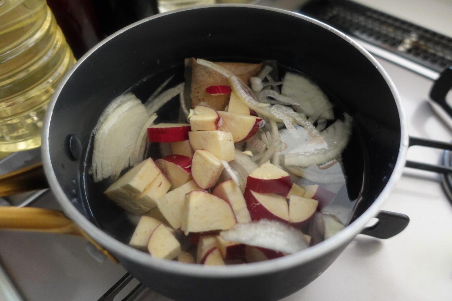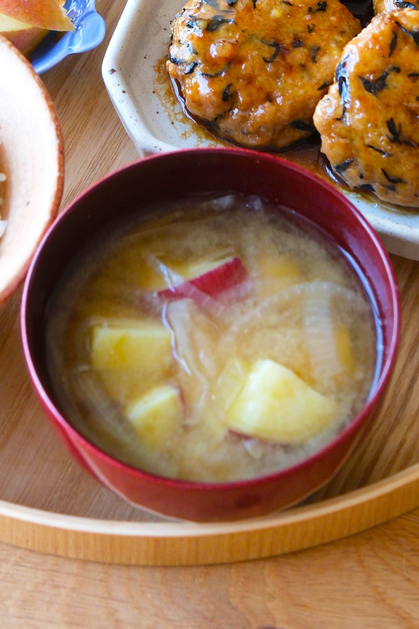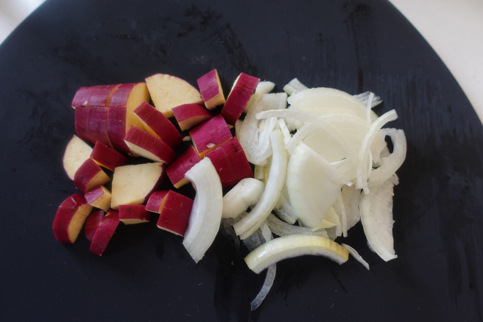 さつまいもは7mm幅のいちょう切りにする。玉ねぎは薄切りにする。