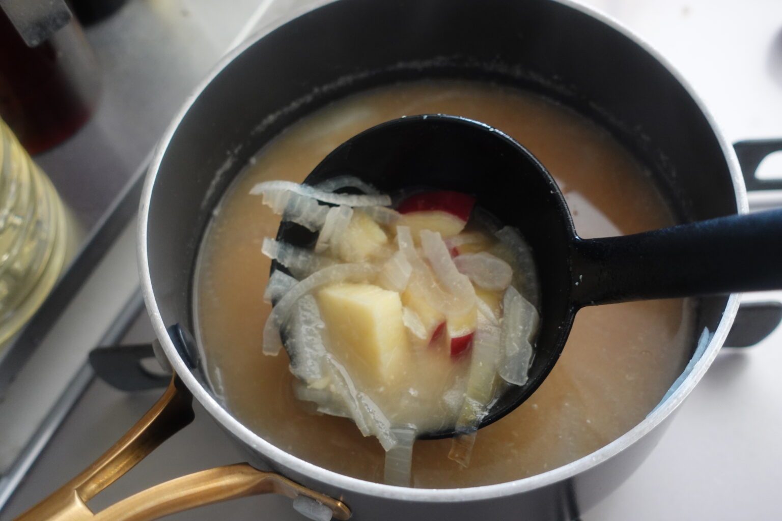 だしパックを取り出して、弱火で味噌を溶きいれる。