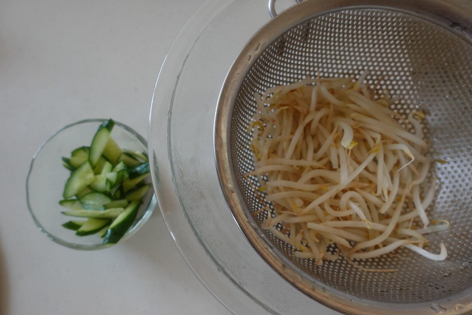 もやしは耐熱容器に入れ、ふんわりとラップをし、600W1分30秒加熱する。ざるにあげて水気を切りながら粗熱をとる。きゅうりは縦半分に切り、斜め薄切りにする。
