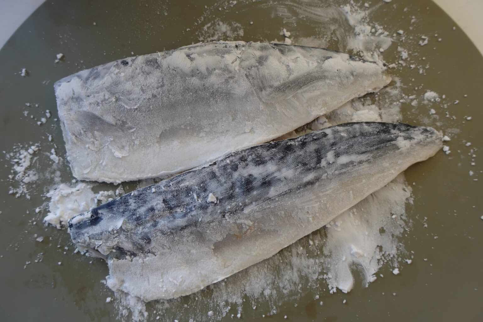 塩サバは表面についている水分をペーパータオルでふき取る。塩こしょうをして片栗粉をまぶす。
