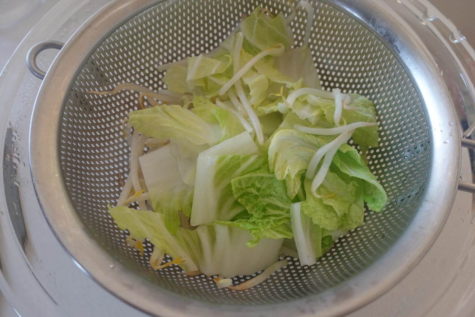 白菜は2cm幅に切る。耐熱容器にもやしと白菜を入れて、ふんわりとラップをし、600W2分30秒加熱する。ざるにあげて水気を切りながら粗熱をとる。