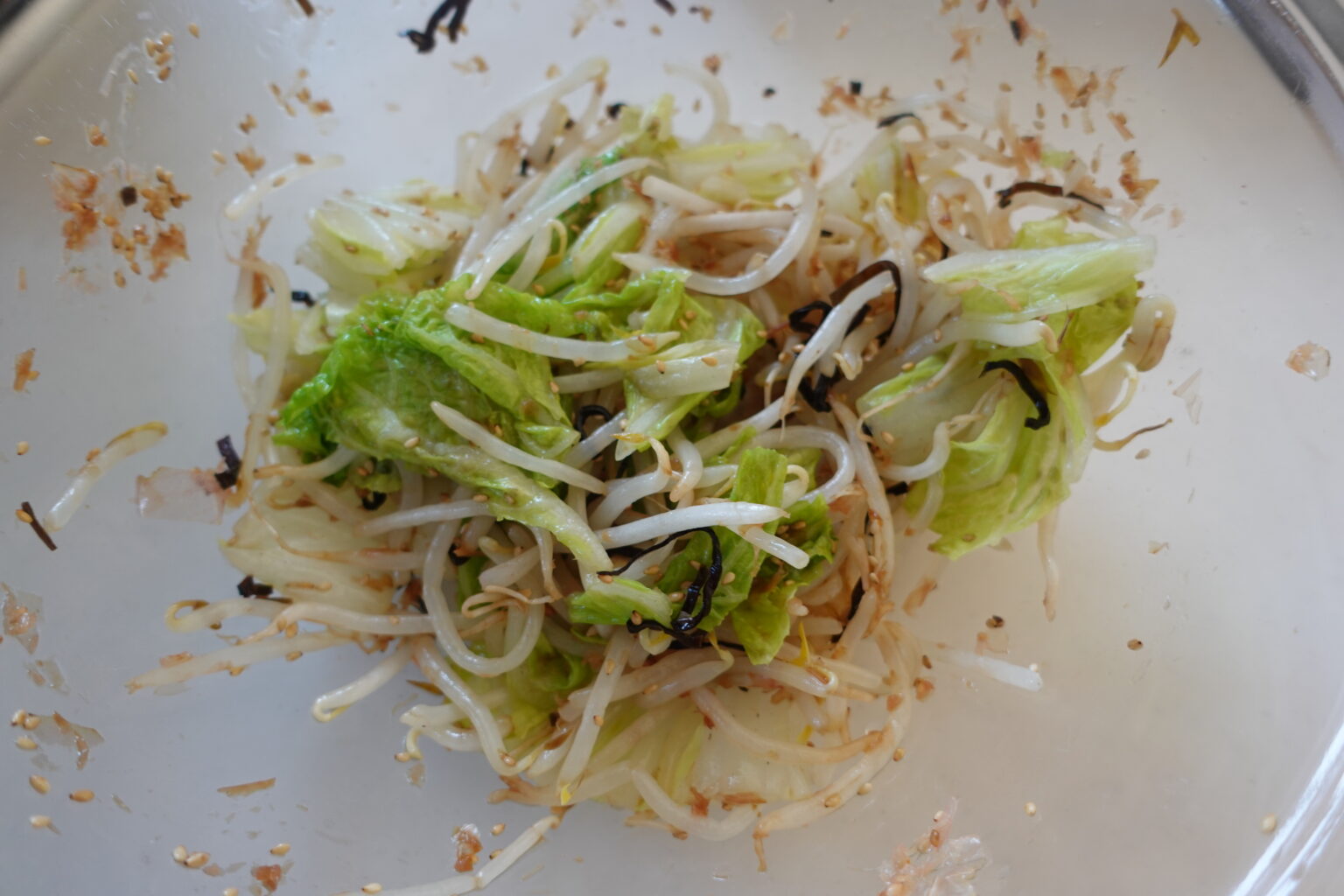 今日の副菜は「もやしと白菜の塩昆布和え」。1/2袋残ったもやしと少し余った白菜。パパッと和えるだけでお箸が止まらない絶品副菜の完成です!味の決め手は削り節。塩昆布の旨みを吸った削り節が野菜にピタッと絡んで噛むほどにおいしい◎火を使わずレンジで完結するのであと一品に困った時の強い味方です!