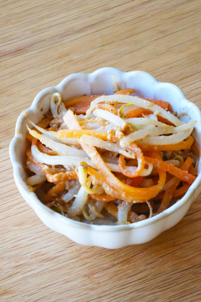 今日の副菜はレンジで簡単「もやしとにんじんのごま和え」。ごまの香りとシャキシャキ食感で、箸が止まらなくなります♪