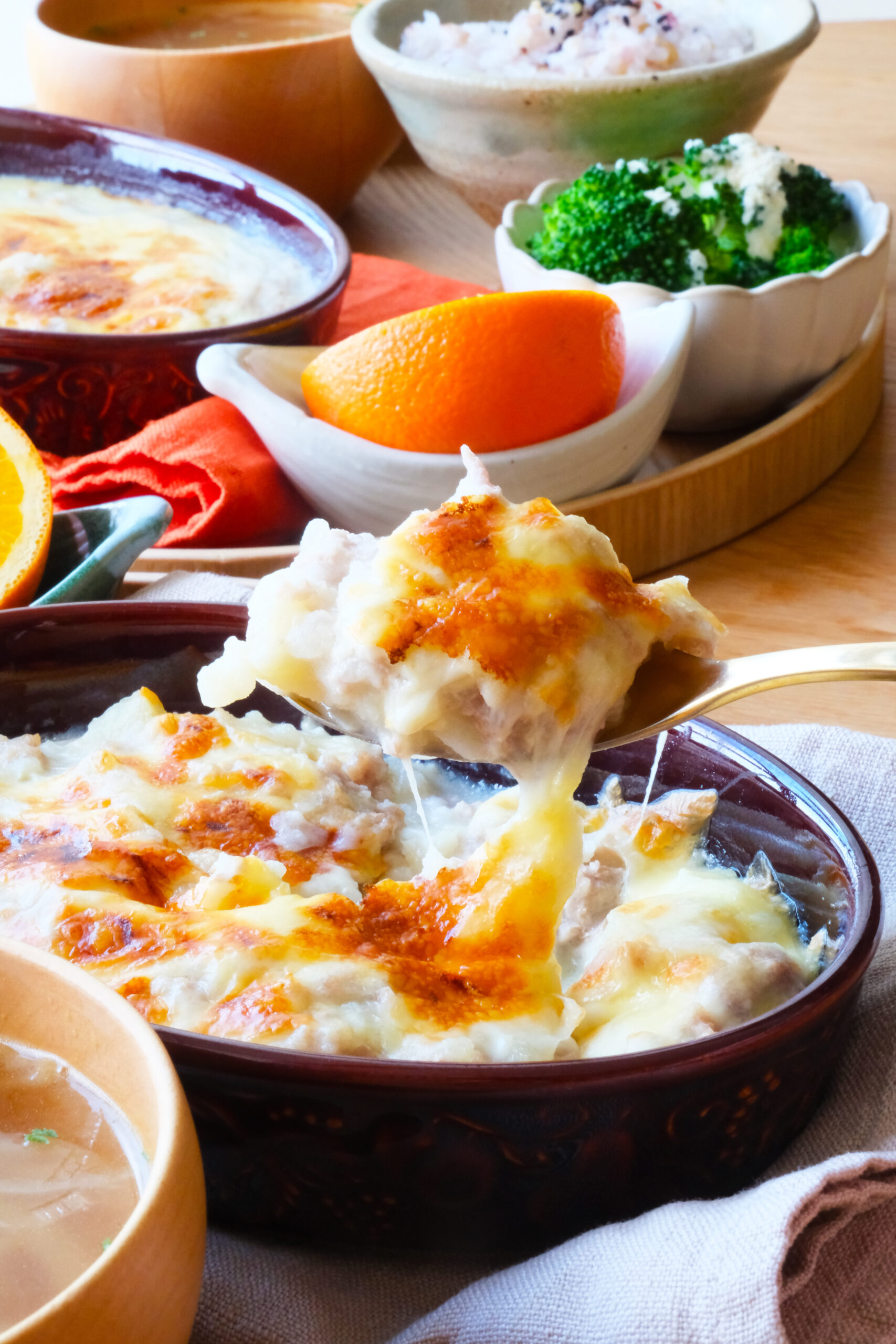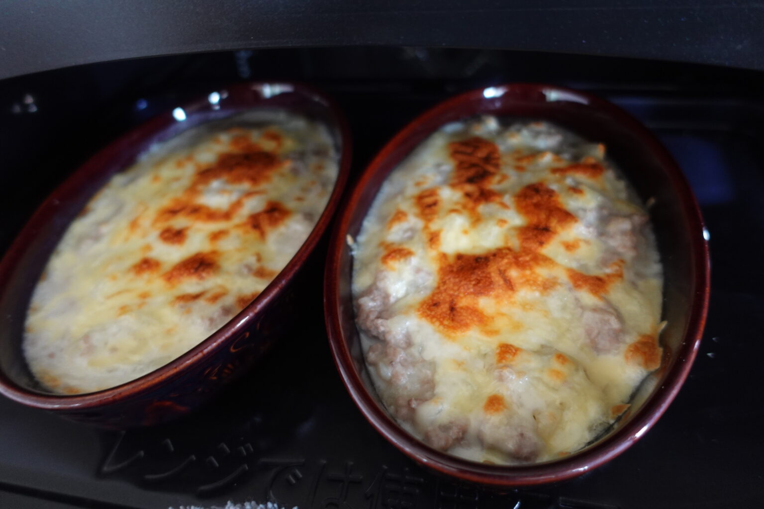 耐熱容器に入れ、ピザ用チーズをかけ、トースターで約5分こんがりするまで焼く。