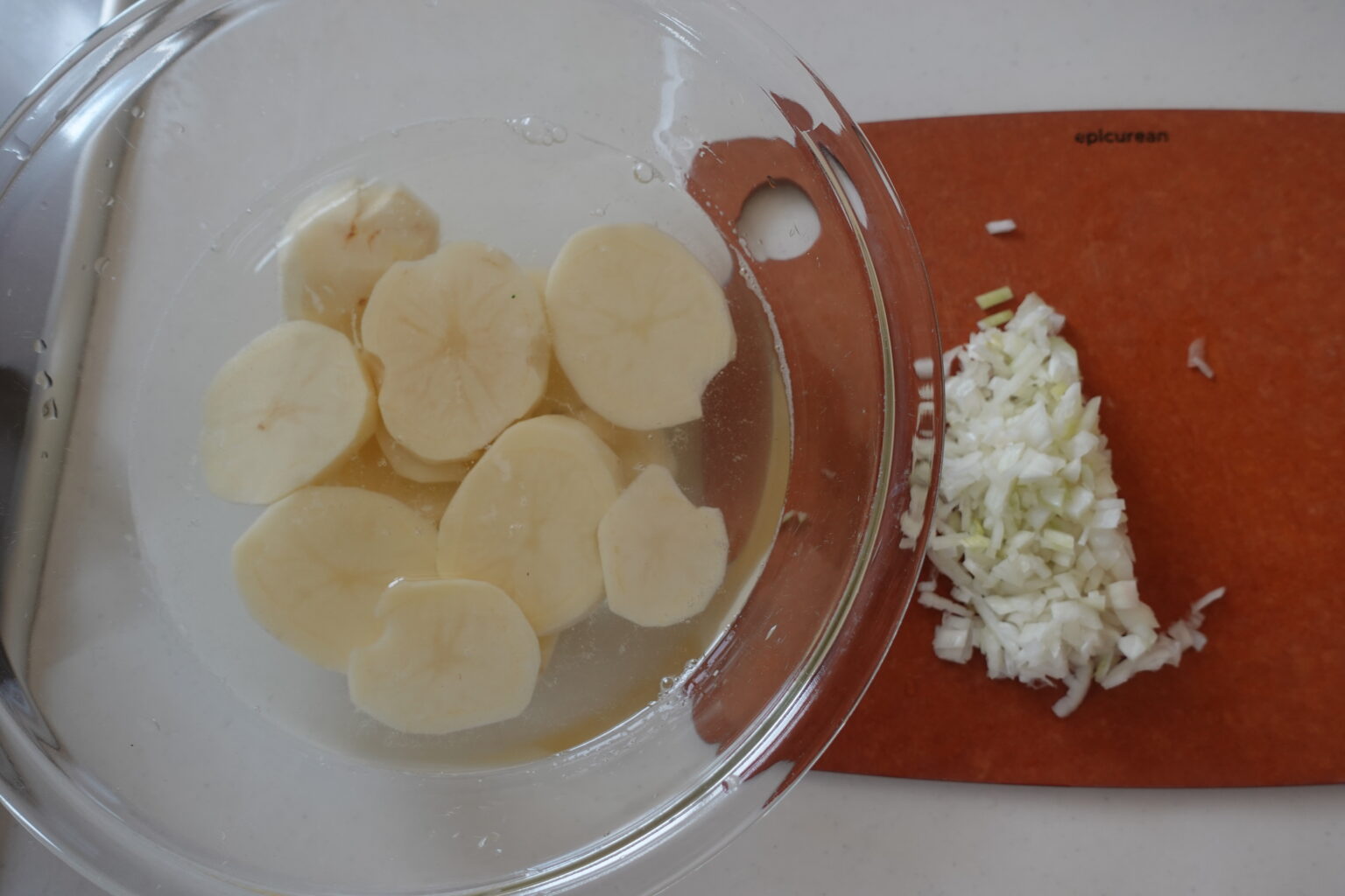 じゃがいも1cm幅の輪切りにして水にさっとさらす。玉ねぎはみじん切りにする。耐熱容器に豚ひき肉、玉ねぎ、じゃがいもを入れて、ふんわりとラップをし、電子レンジ600W10~15分加熱する。(途中で様子を見ながら加熱時間を調整してください)。
