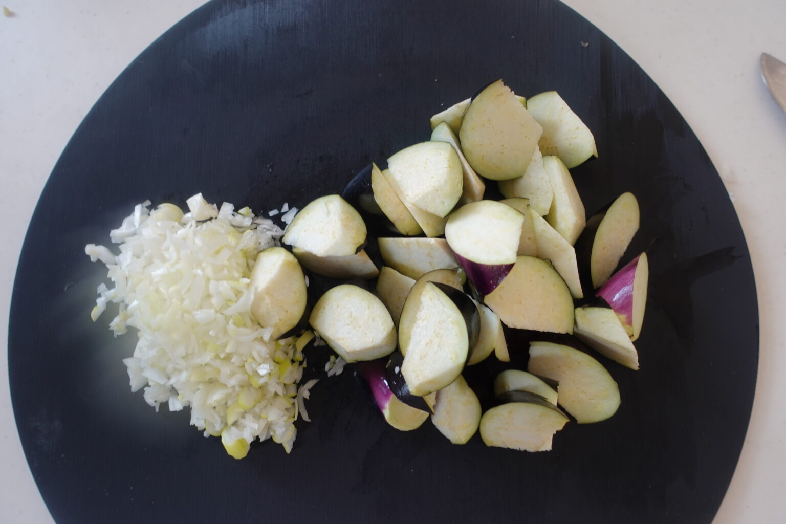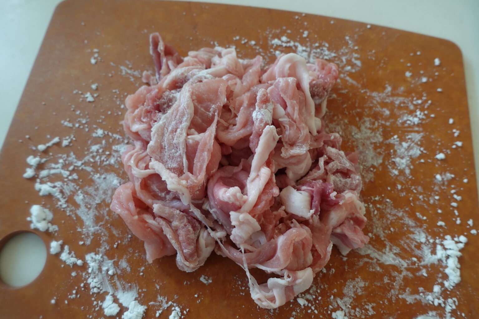 長ねぎはみじん切りにする。なすはヘタを切り落とし乱切りにする。豚こま肉は片栗粉をまぶしながら食べやすい大きさにちぎる。