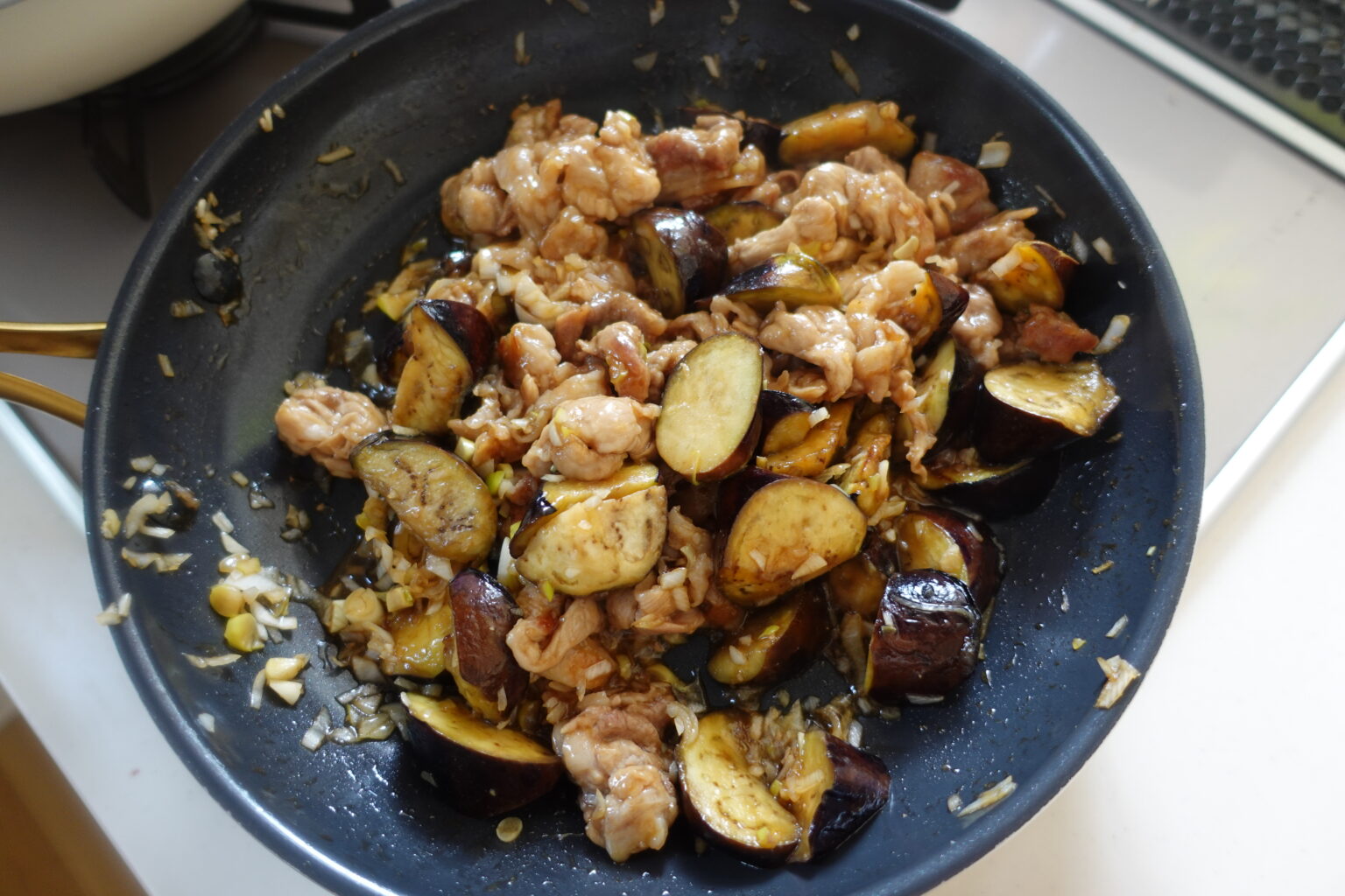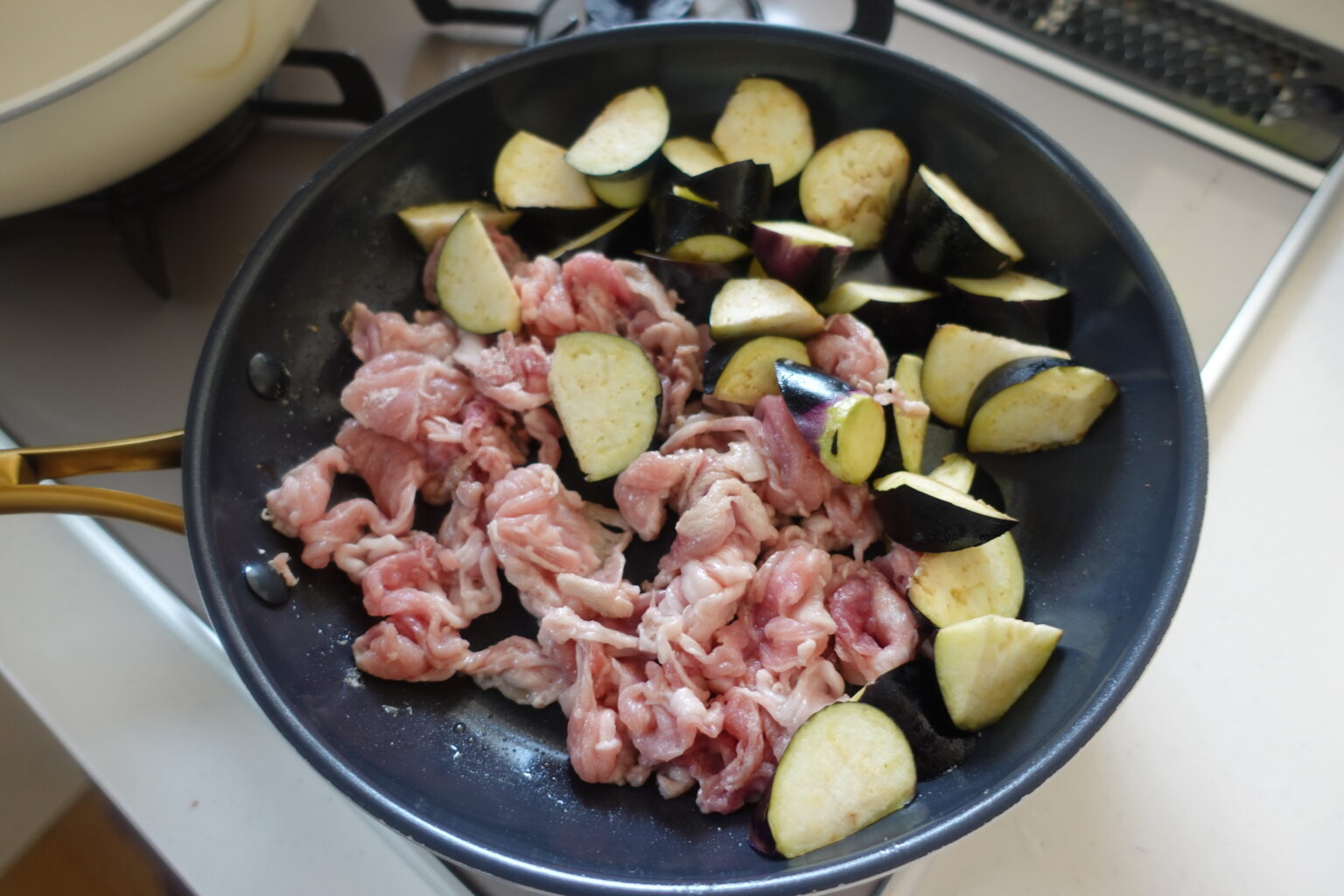 フライパンにごま油を熱し、なすと豚こま肉を入れて中火で炒める。