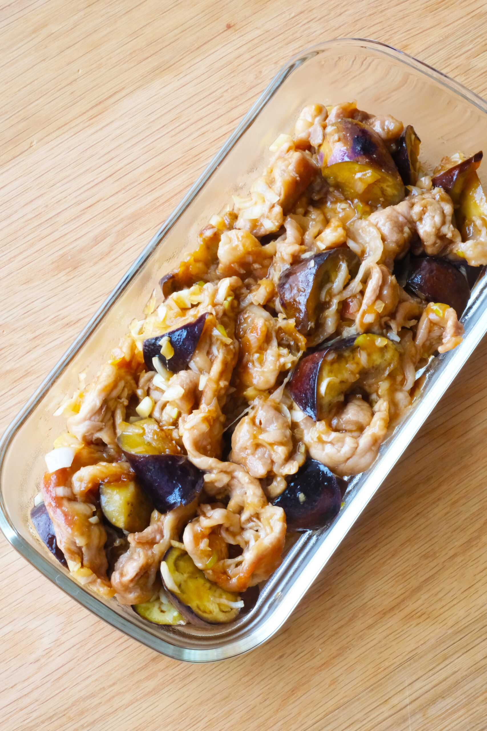 フライパンにごま油を熱し、なすと豚こま肉を入れて中火で炒める。