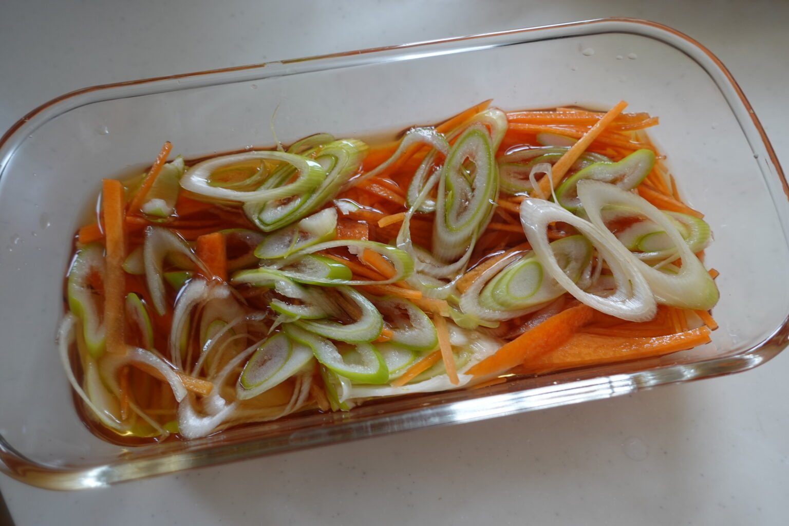 人参は千切りにする。長ねぎは斜め薄切りにする。Aを合わせて南蛮酢を作る。