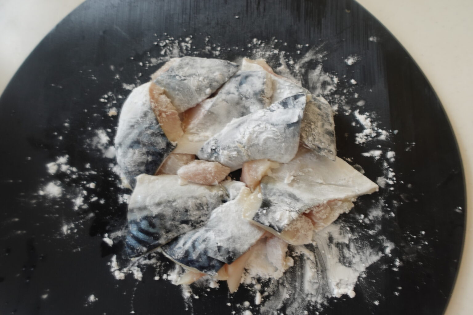 骨取り塩サバ(半身)はペーパータオルで表面についた水分を拭き取る。一口大に切り、片栗粉をまぶす。