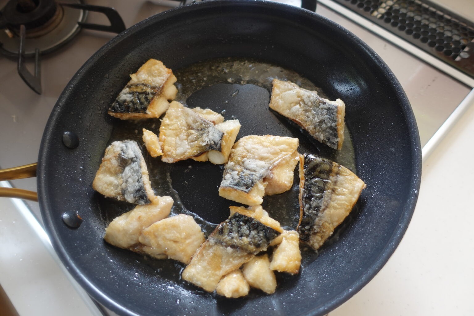 フライパンに油を熱し、菜箸から細かい泡が出てきたら塩サバを並べて揚げ焼きにする。