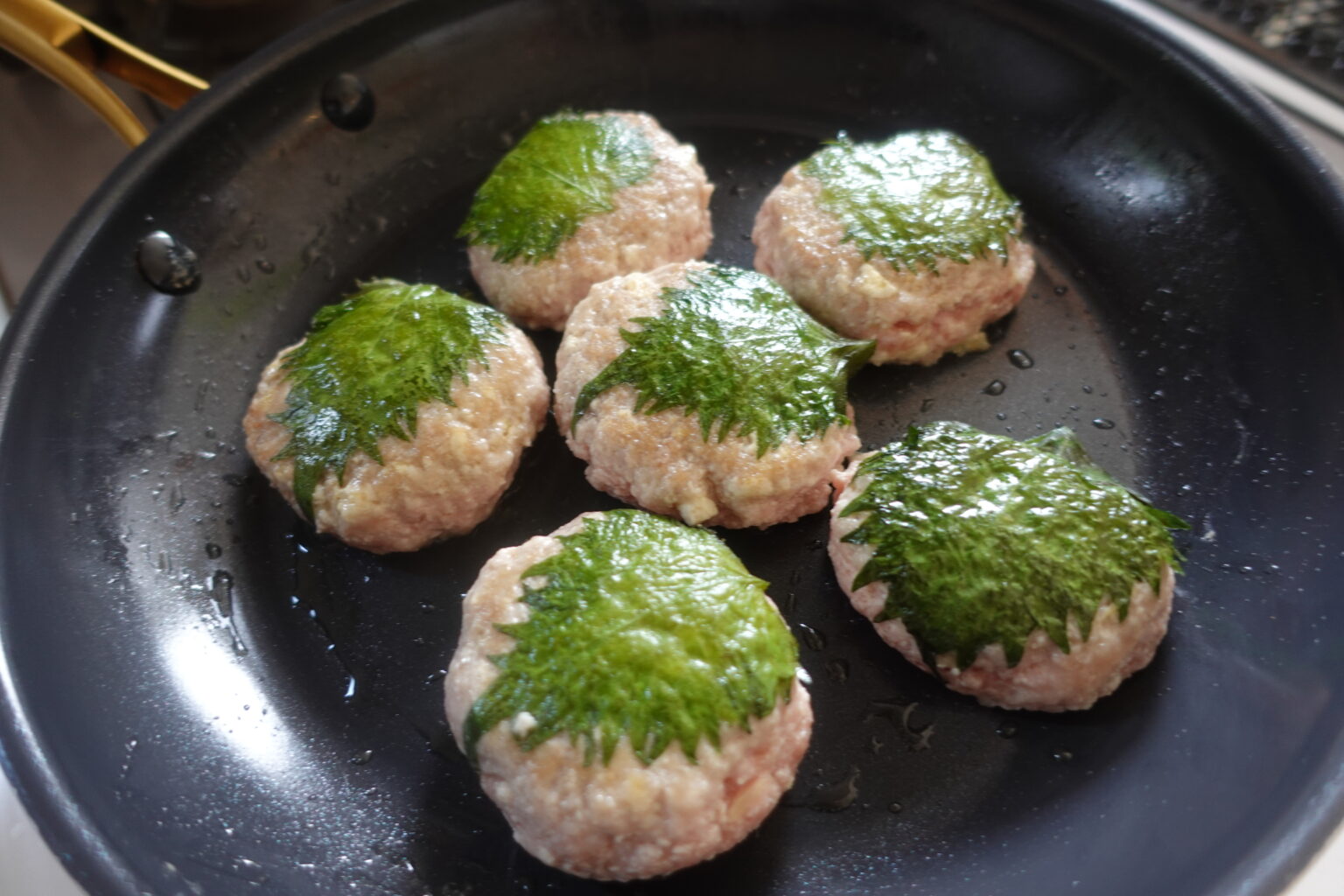 フライパンにごま油をひき、1を6等分に丸めて青じそを巻き付けて並べる。中火にかけて、焼き色がついたら裏っ返してさらに焼く。