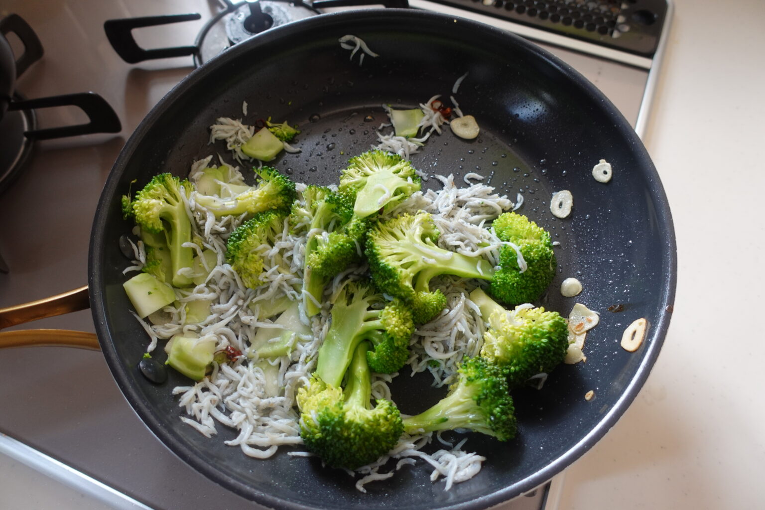 香りがたってきたら、しらすとブロッコリーを加えて中火で炒める。