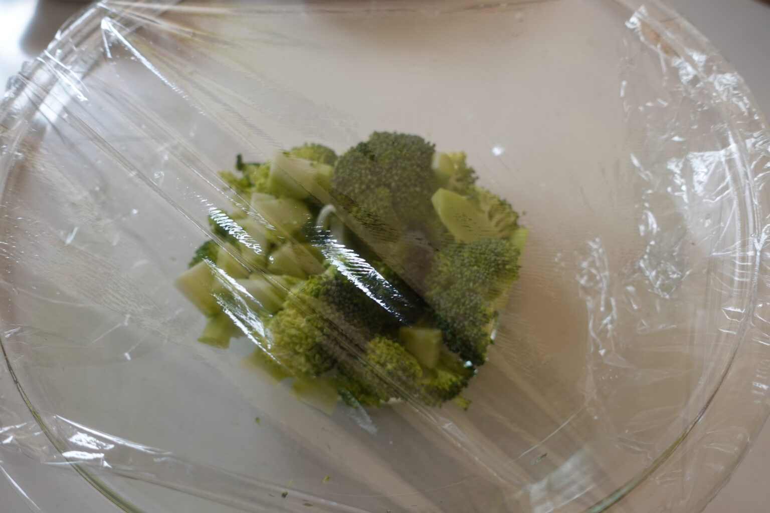 ブロッコリーは水を張ったボウルに入れて左右に揺らしながら振り洗いする。ブロッコリーは小房に分け、茎の部分は厚めに皮を剥いて薄切りにする。耐熱容器に入れて水大さじ1をふり、ふんわりとラップをして600w1分30秒加熱する。