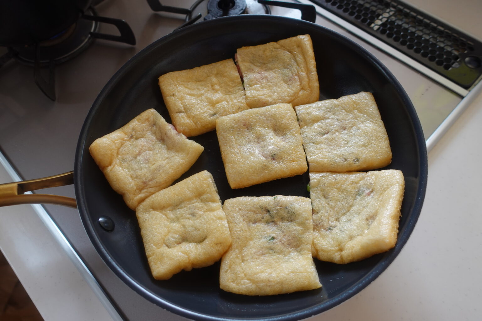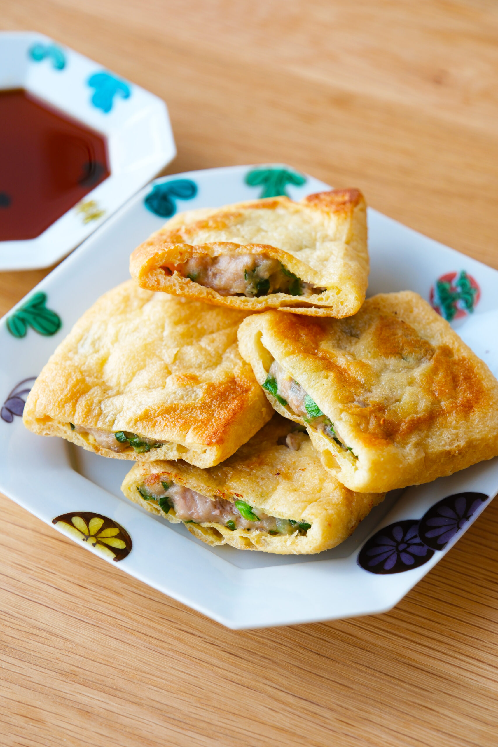 今夜は油揚げで作る「ニラ餃子」。餃子の皮の代わりに油揚げを使って、食べ応え満点の「油揚げニラ餃子」を作りました!作り方はとっても簡単♪油揚げを半分に切って肉だねを詰めるだけ!見栄えも抜群で食卓に出すとテンションが上がるイチ押しメニューです!ぜひ作ってみてくださいね。