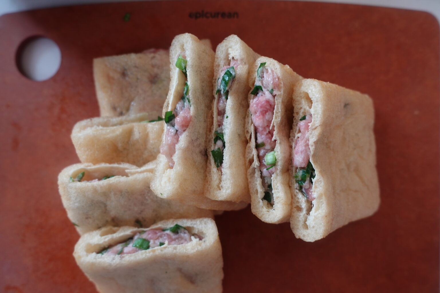 ボウルに豚ひき肉、1のニラ、Aを入れてよくこねる。油揚げは半分に切り、油揚げのポケットに肉だねを詰める。