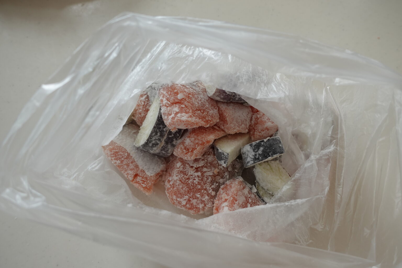 鮭の切り身(骨抜き)はキッチンペーパーで表面についた水分を拭き取り、一口大に切る。なすは1㎝幅の半月切りにする。ポリ袋に入れて片栗粉をまぶす。