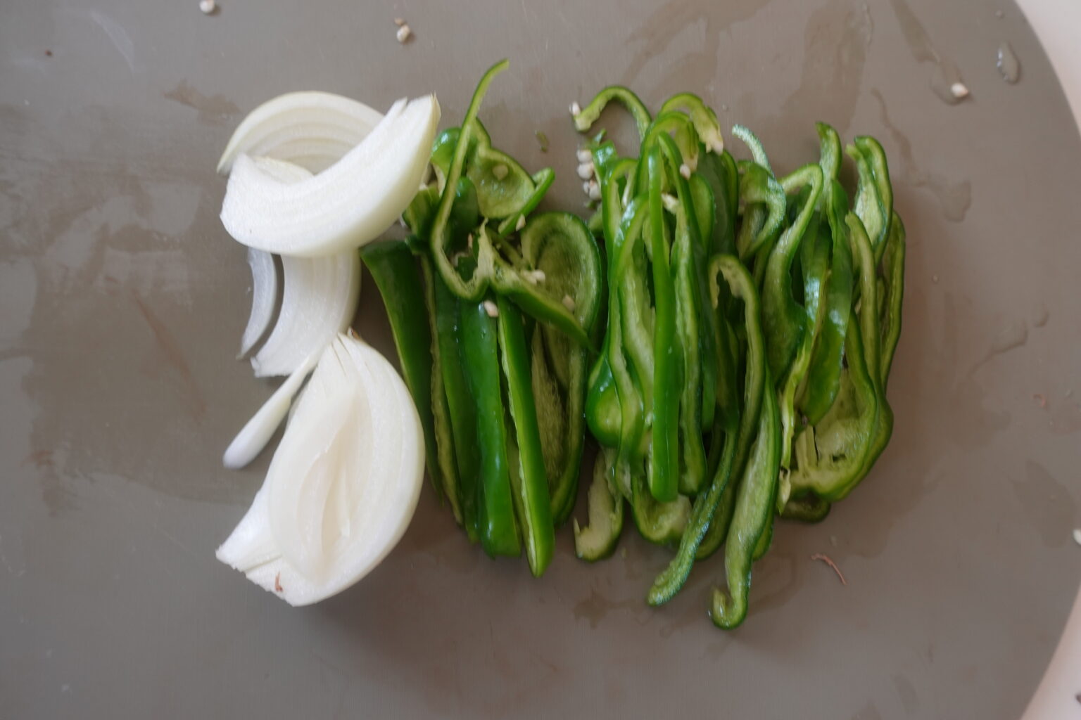 ピーマンはヘタと種を取り除き、細切りにする。玉ねぎは薄いくし切りにする。