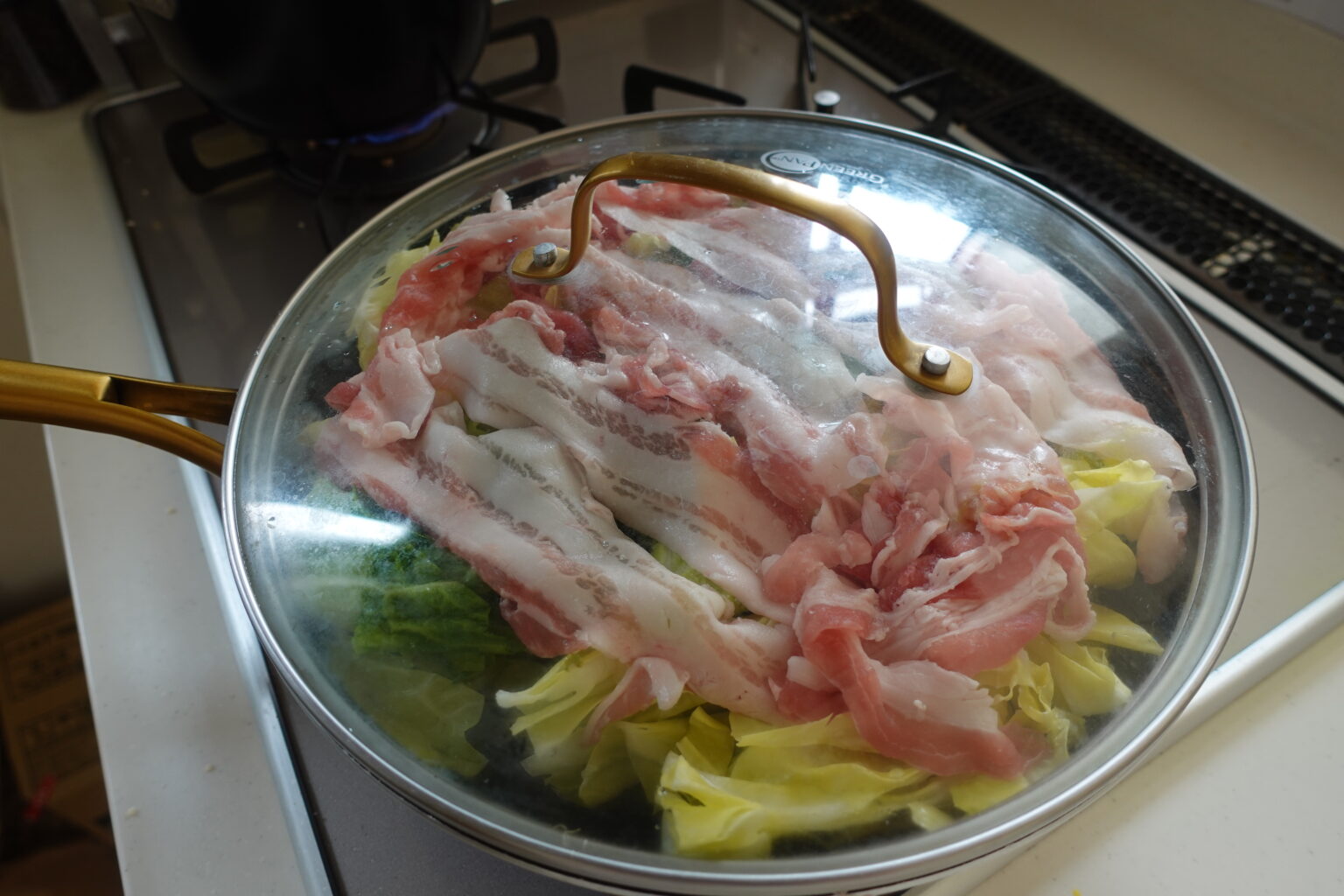 フライパンに春キャベツを敷き、その上に豚バラ肉を広げてのせて酒をふる。蓋をして中火で約10~12分、豚バラ肉に火が通るまで蒸し焼きにする。