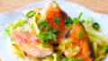 新じゃがいもは皮をむかずに一口大の乱切りにして水にさらす。水気を切り、耐熱容器に入れ、ふんわりとラップをし電子レンジ600W3分加熱する。