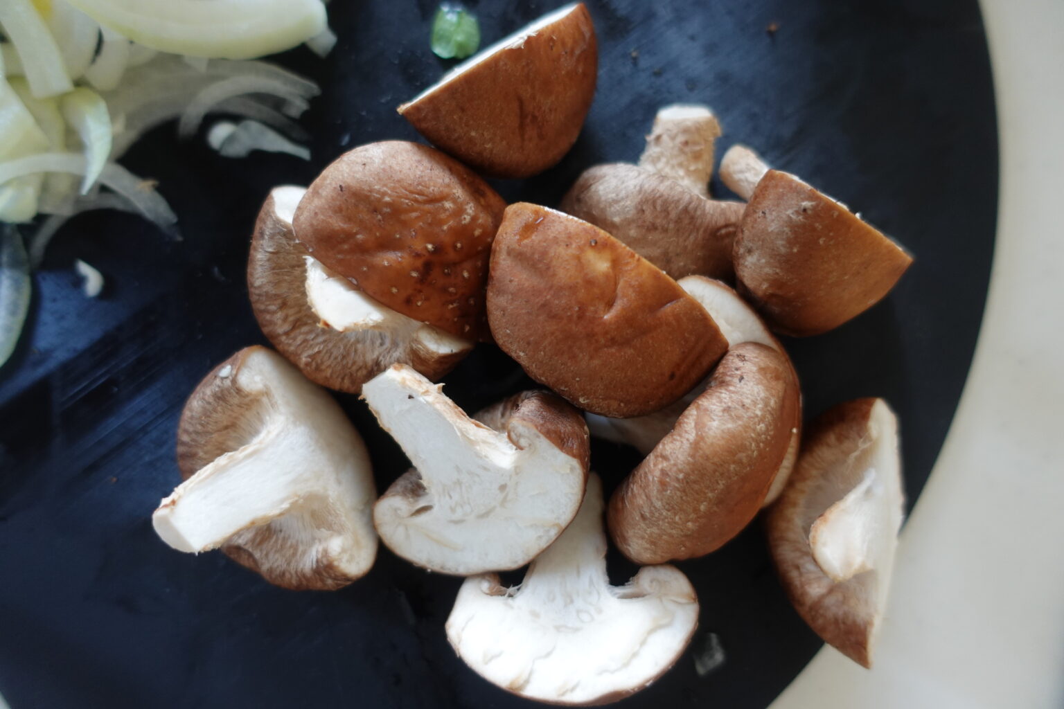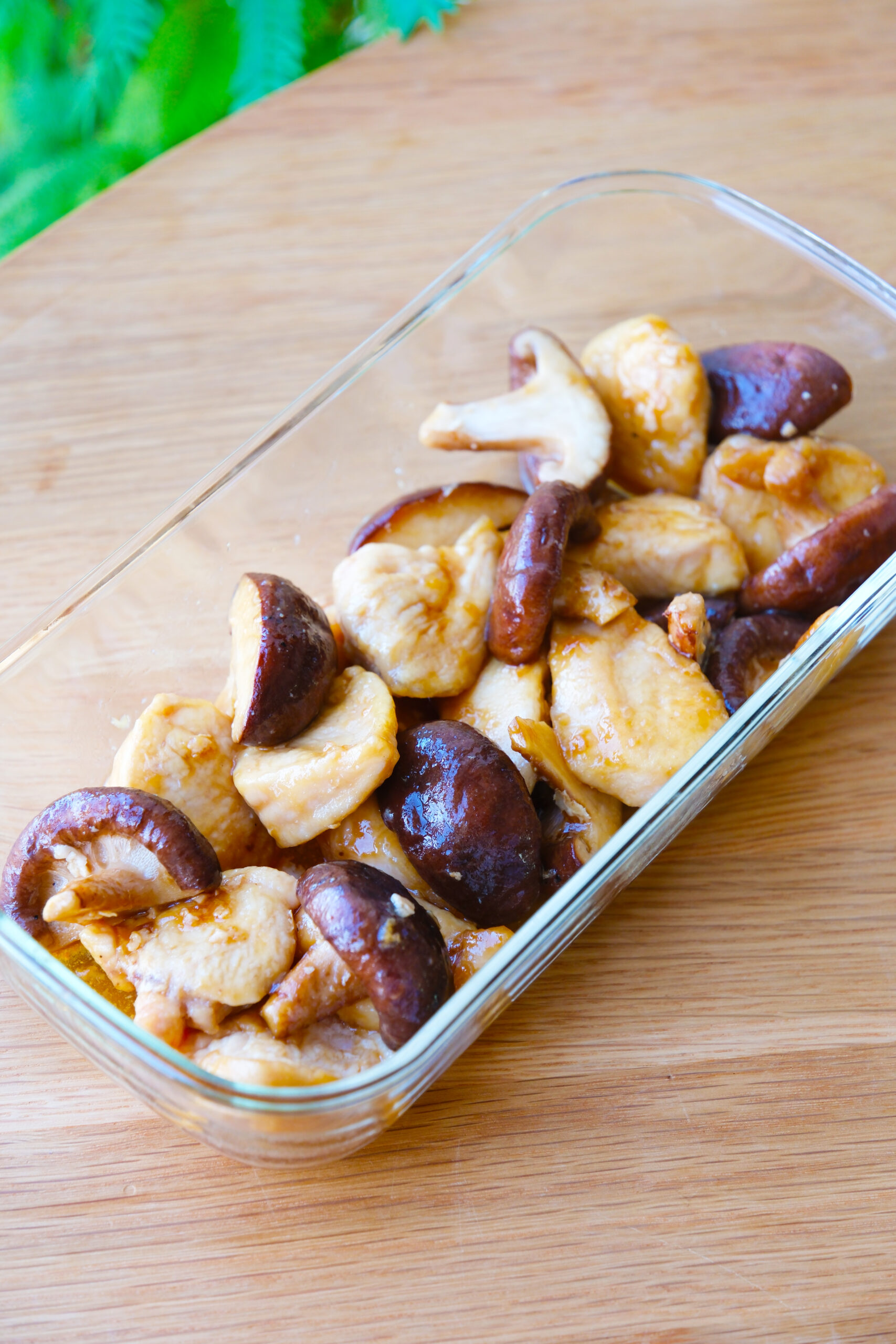 鶏むね肉は表面についている水分をペーパーでふき取り、一口大のそぎ切りにする。片栗粉をまぶす。椎茸は石づきを切り落とし、半分に切る。