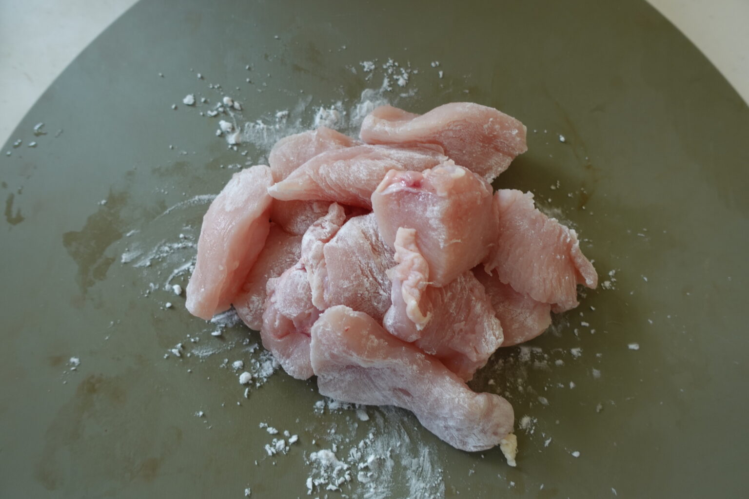 ・鶏むね肉は片栗粉をまぶすことでしっとり柔らかく仕上がる&たれとの絡みもよくなります。