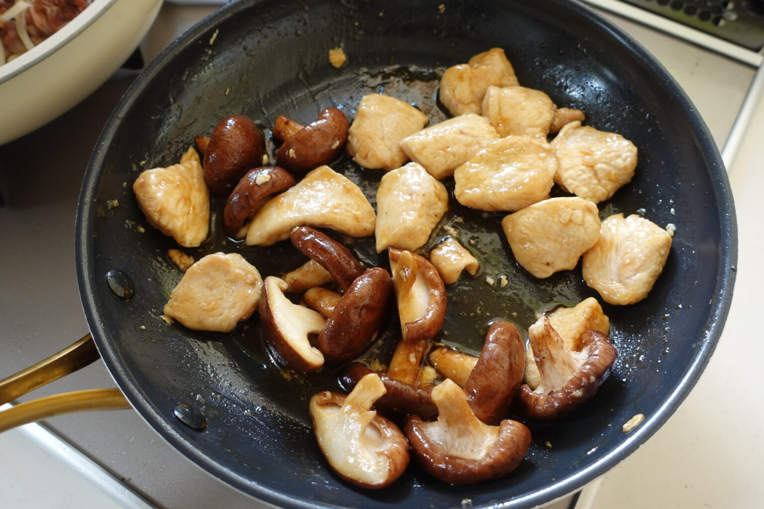 フライパンに油を熱し、鶏むね肉の皮目を下にして並べ、中火で炒める。表面に焼き色がついたら椎茸を加えてさらに炒める。